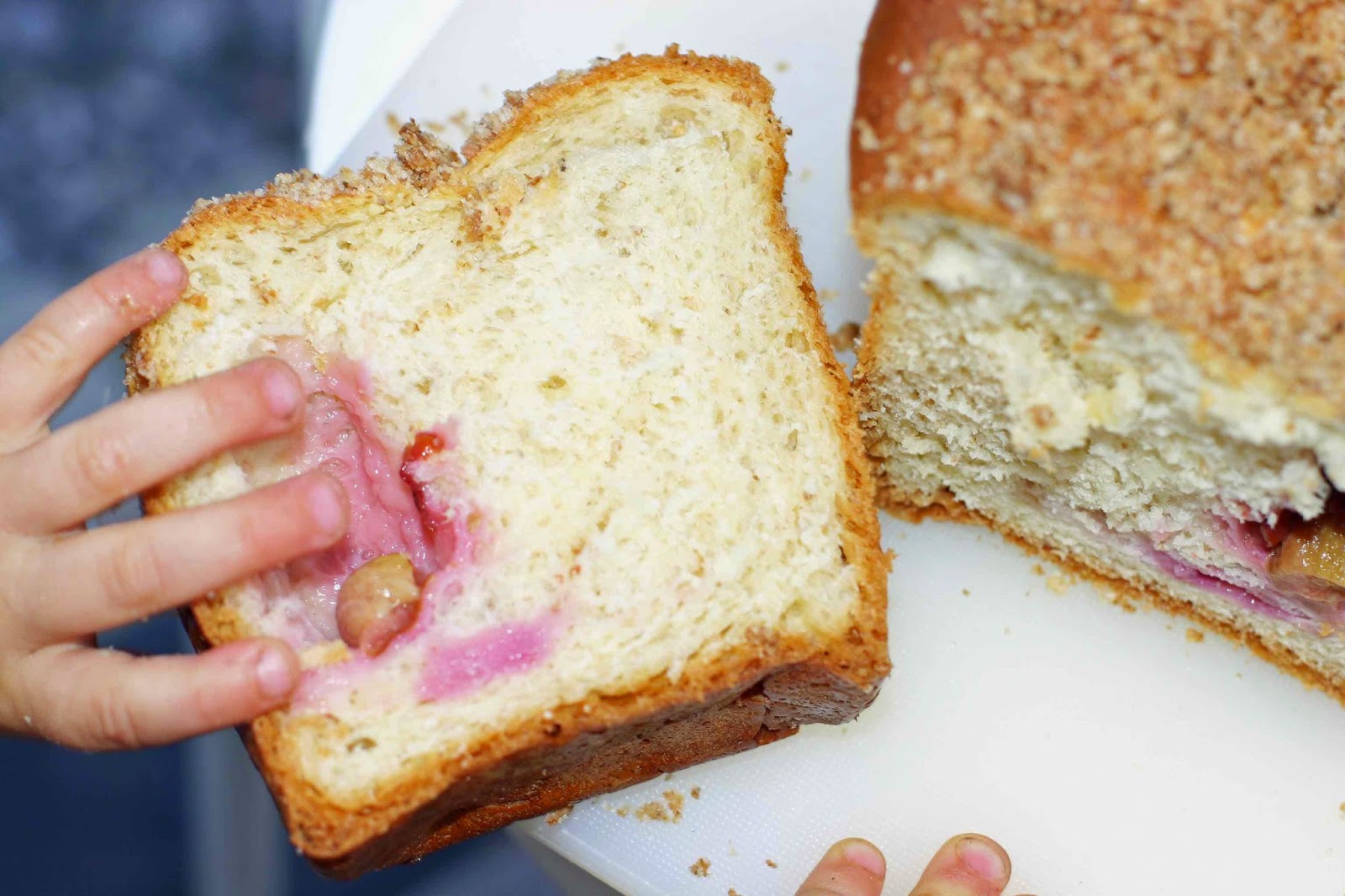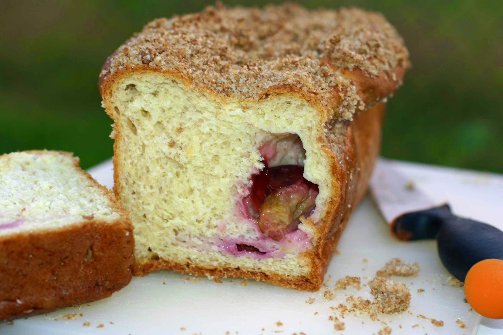 Po tym czasie ciasto rozwałkować na prostokąt o wymiarach około 40 na 25-30, jak się nie będzie dało to rozciągnąć na stolnicy, poukładać śliwki, zawinąć wzdłuż dłuższego boku, jak dywan, powstanie długi rulon, rulon przekroić na dwa mniejsze rulony,. Przełożyć do keksówek, wysmarowanych masłem i wysypanych bułką tartą lub otrębami (ja użyłam silikonowych form, więc nie musiałam niczym smarować). Ostawić do wyrośnięcia., ma wystawać ponad keksówkę.