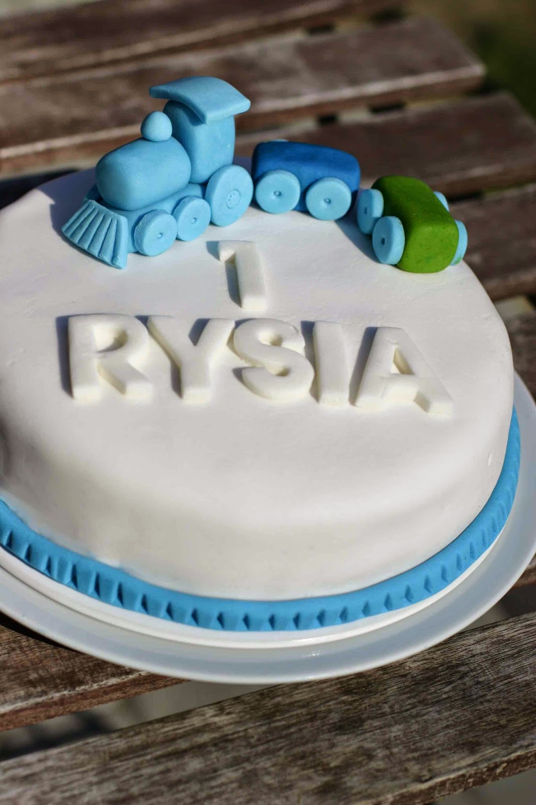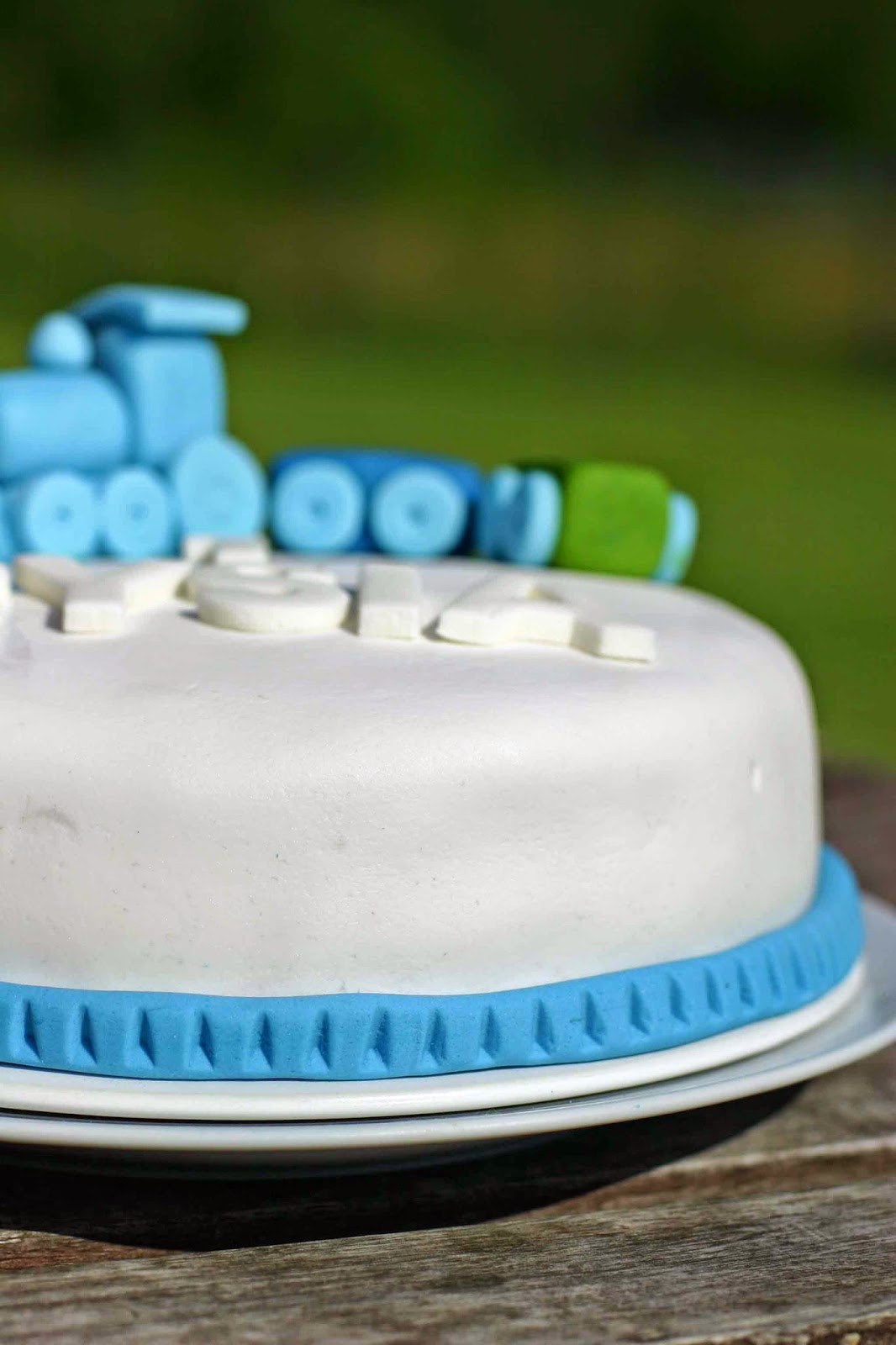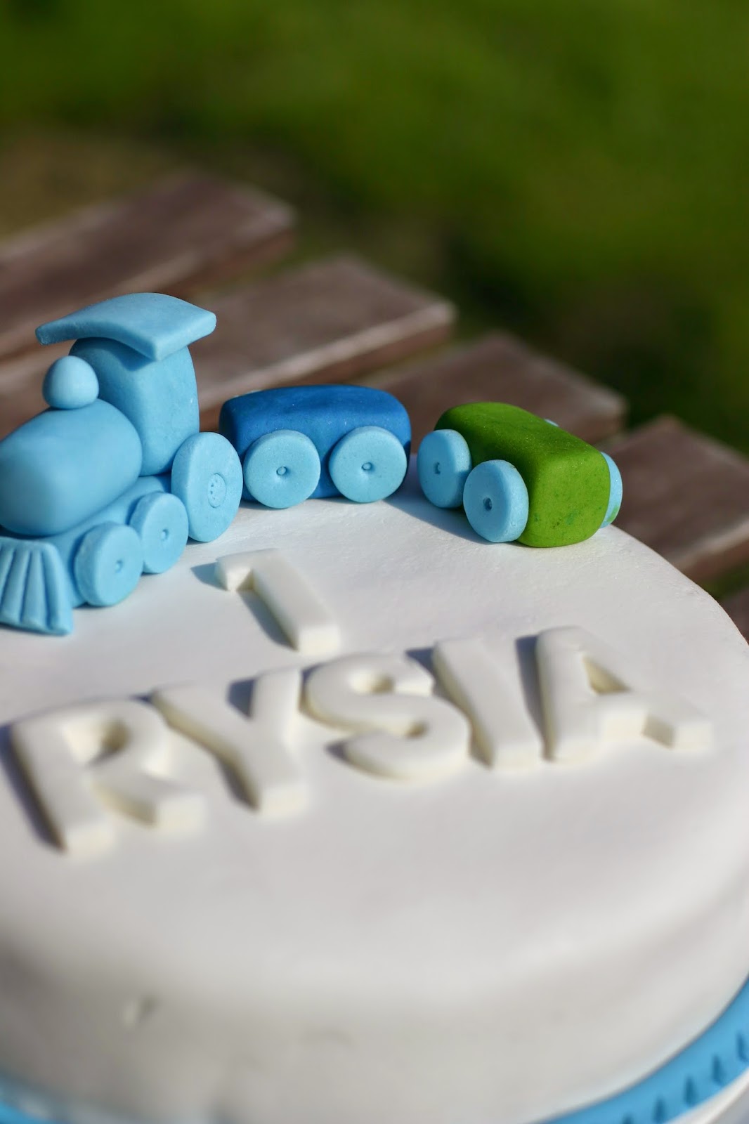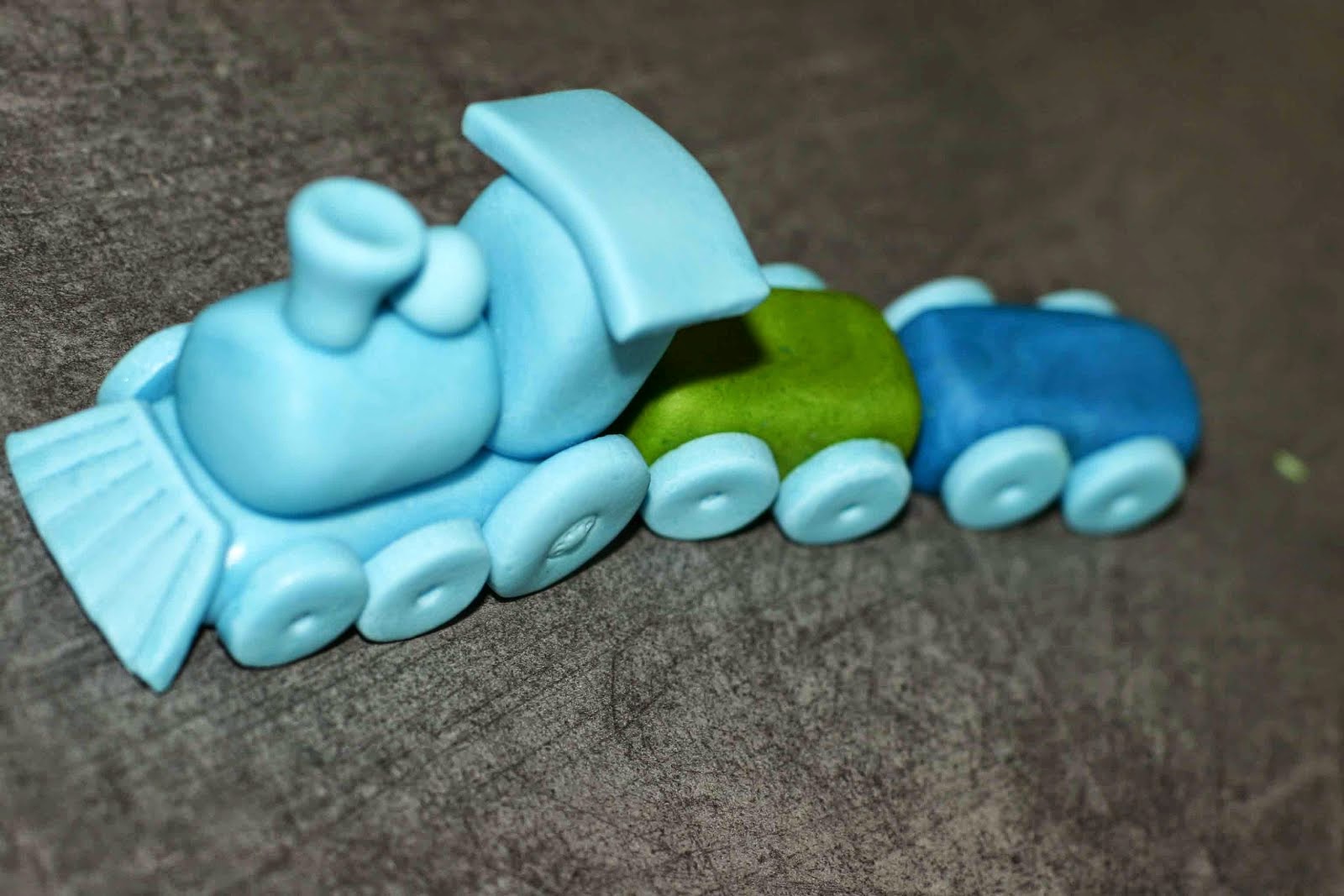 8) Z pozostałej masy lepimy ozdoby, literki i falbanki. Jeżeli chcemy zrobić kolorową ciuchcię to masę najpierw trzeba podzielić na parę części, jeżeli chcemy 3 kolory to dzielimy na 3 części, jeżeli 4 kolory, to na 4 itd. Mój tort był powleczony niebarwioną - białą masą, literki też były wycięte z białej masy, falbankę i ciuchcię zrobiłam z masy zabarwianej na błękitno, jeden wagonik był granatowy, drugi zielony.