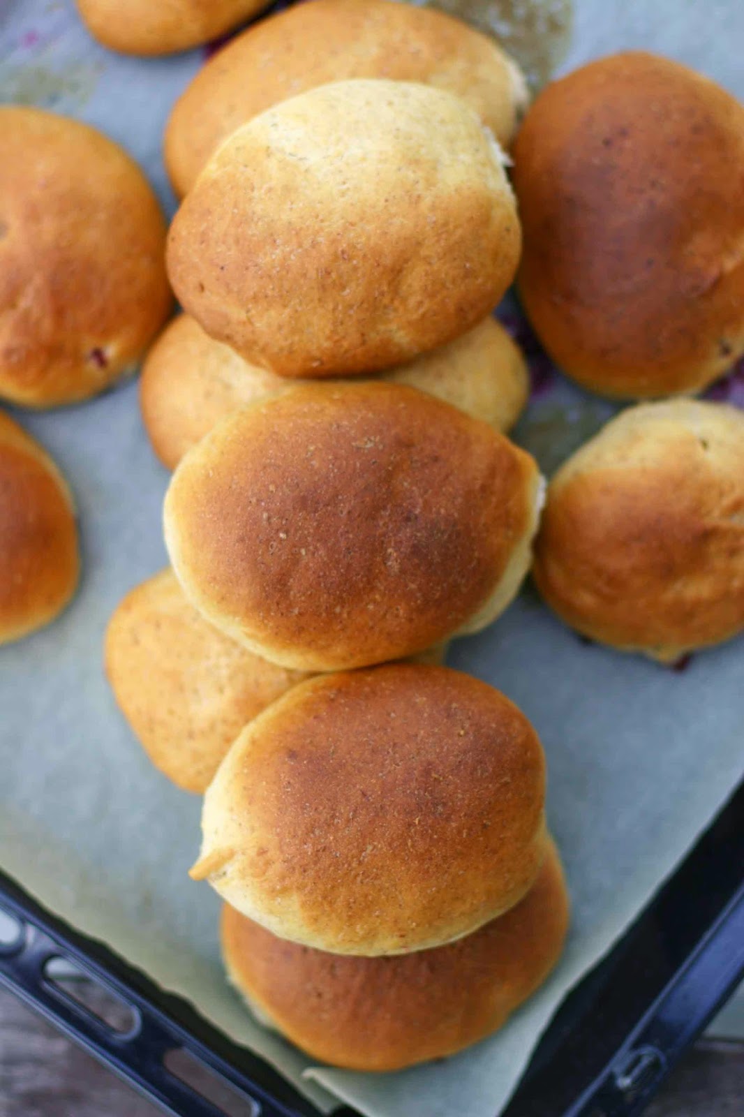 Następnie ciasto krótko wyrobić, podzielić na 15 części (ok. 60g każda). Uformować jak bułeczki, w kule, i znów pozostawić na 15 minut do napuszenia. Z każdej kuli zrobić placek (można rozwałkować, ja to robię dłonią) i na jego środku umieścić kopiastą łyżkę farszu. Zlepić placki jak pierogi, dokładnie dociskając. Każdą umieścić złączeniem w dół na blacie stołu i delikatnie lecz zdecydowanie rolować nadając im kształt owalnych bułeczek. Gotowe umieścić na wyłożonej papierem do pieczenia blaszce w dużych odstępach od siebie i pozostawić do wyrośnięcia na 45 minut.