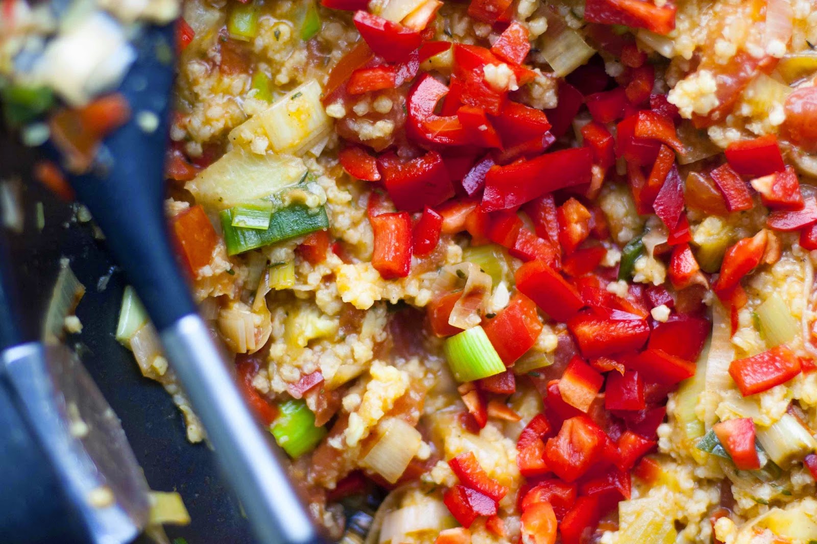 Na patelni rozgrzać oliwę, zeszklić pora. Dodać paprykę, poddusić 2 minuty, dodać cukinię, poddusić dwie minuty, dodać pomidory, poddusić 10 min na średnim ogniu, tak aby z sosu wyparowała woda (nie musi wyparować cała). Dodać ugotowaną kaszę, dodać przyprawy, wymieszać, poddusić na średnim ogniu przez 5 min.