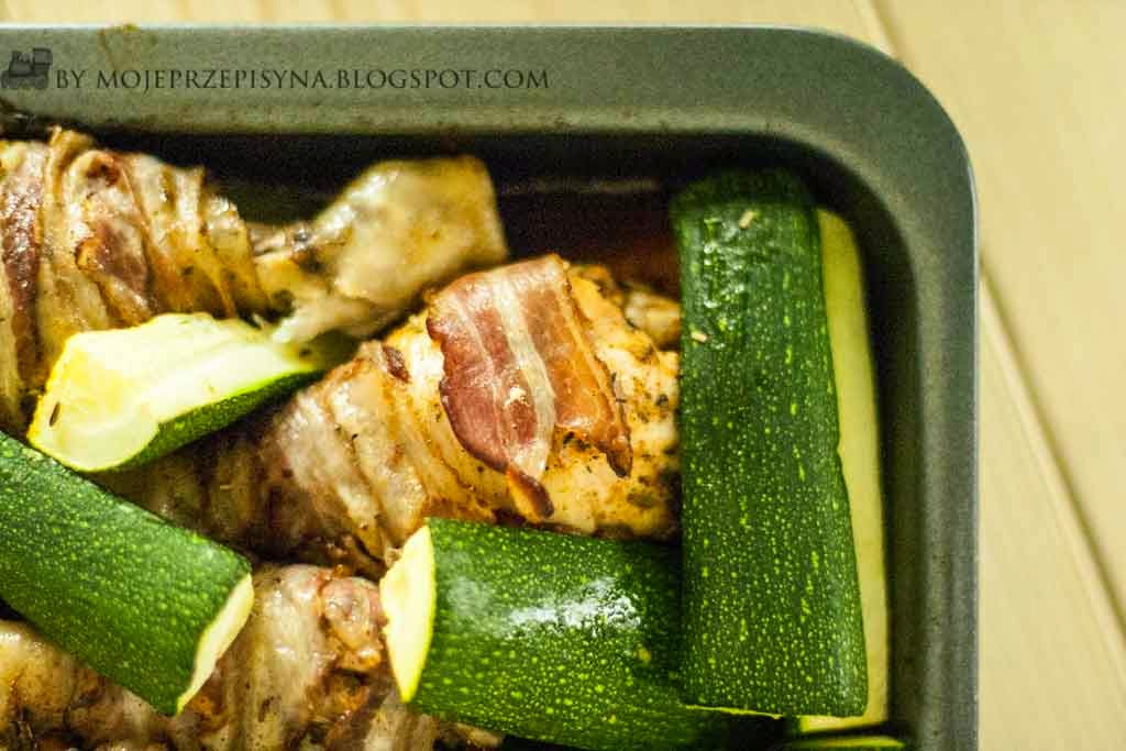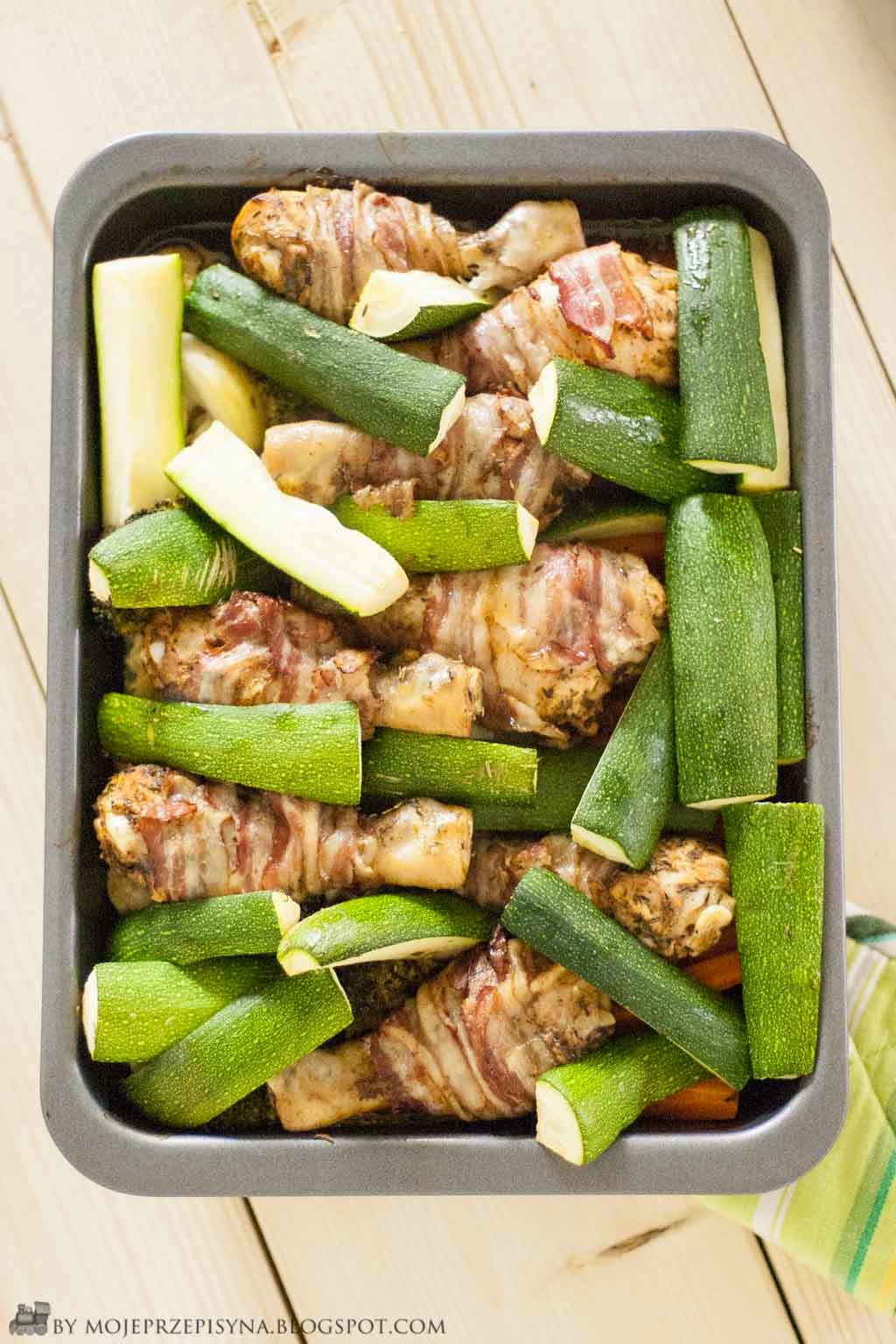 Marchewkę i cukinię pokroić w słupki. Cebulę podzielić na 6 części. Na blaszce od piekarnika poukładać warzywa. Kurczaka zawinąć w plastry boczku, następnie ułożyć na blaszce między warzywami. Pozostałą marynatą polać warzywa i mięso. Posypać rozmarynem, kminem, solą i pieprzem i czosnkiem.