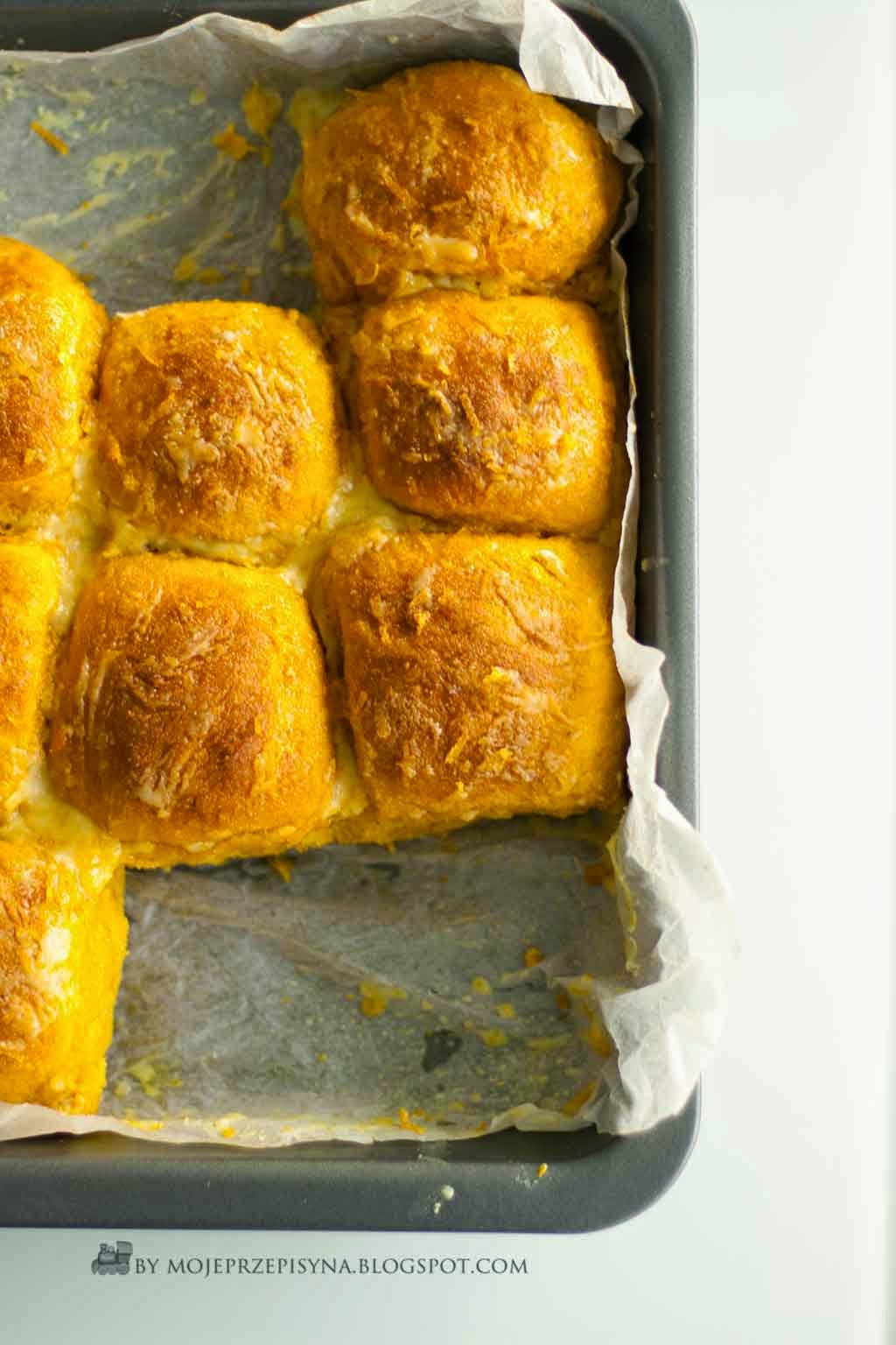 Bułkę wysypać na płytki, duży talerz, ręce wysmarować tłuszczem, ręce wytarzać w bułce i odrywać kawałek ciasta wielkości dwóch orzechów włoskich. Formować kulkę. Układać w formie, jedna przy drugiej. Odstawić do ponownego wyrastania około 20 min – mają się mocno napuszyć. Piekarnik nagrzać do 180 st. Wstawić bułeczki, piec 25 min z grzałką góra-dół.